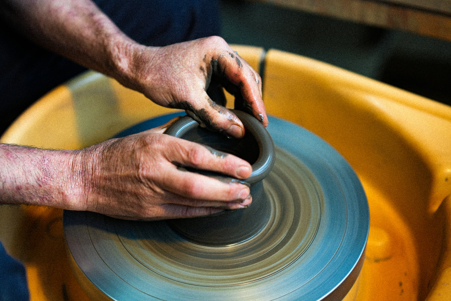 In Bizen pottery, where the clay itself becomes the vessel, the selection and preparation of clay is crucial, and the clay's character defines the individuality of each kiln and artisan. After shaping with a potter's wheel or hand-building techniques, the pieces are naturally dried and fired in climbing kilns or electric kilns. The firing of Bizen pottery is typically conducted using split red pine wood.