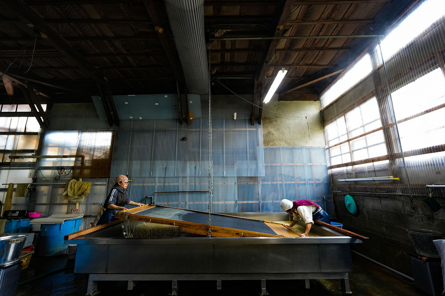 手漉き和紙には二種類の漉き技法があり、一つは欧米などで多用される「溜め漉き」。紙の原料となる紙料をすくい取って紙を漉く技法です。もう一つは、日本古来の和紙漉き技法である「流し漉き」。紙料をすくい、流す、すくって流す…この工程を繰り返して紙の層を積み重ねて紙厚をつくり、桁を動かし流すことにより原料繊維が絡み合い丈夫な紙「和紙」を漉いていきます。